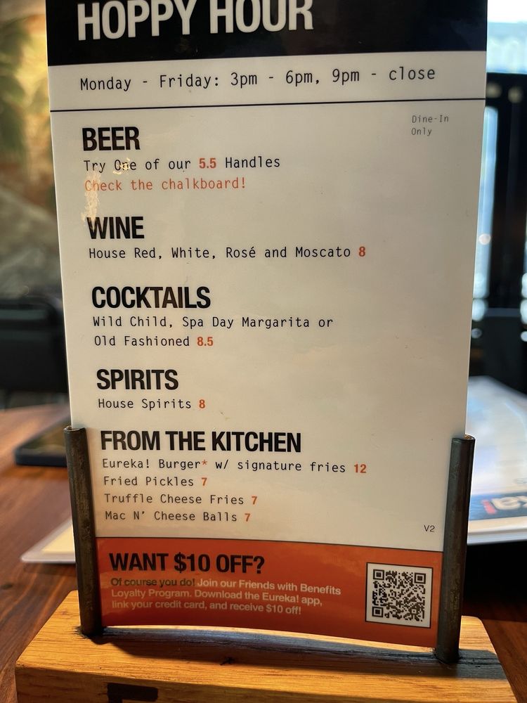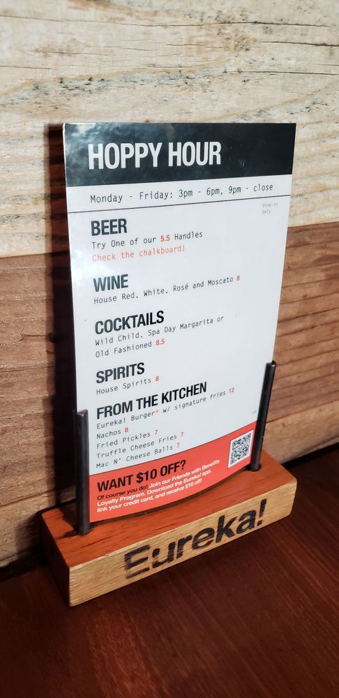 Eureka! Ontario is a trendy cocktail bar and burger joint located in Ontario, CA. With a focus on New American cuisine, this restaurant offers a variety of options for both pescatarians and vegetarians. The establishment is wheelchair accessible, with a gender-neutral restroom and outdoor seating available. Known for its friendly service and delicious food, customers have praised the attentive staff and quality dishes. Highlights of the menu include the Wild Child Cocktail with watermelon and mint, the Fresno Fig Burger with truffle fries, and the Orange Wheat Beer for a refreshing drink option. The cozy ambiance and welcoming atmosphere make Eureka! Ontario a great place for a casual meal or a night out with friends. With a range of amenities such as happy hour specials, TV screens, and pool tables, this spot offers something for everyone.